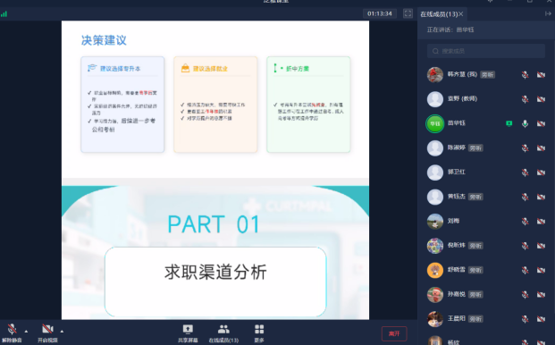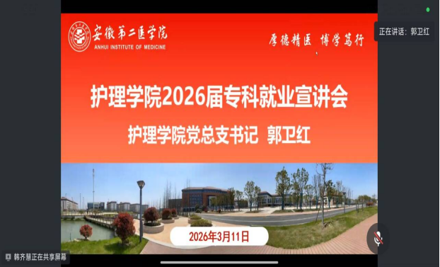 此次线上就业宣讲会的成功举办,有效搭建了学院与校友与学弟学妹的沟通平台,为专科护理毕业班学生提供了精准、实用的就业指导。未来,护理学院将持续聚焦毕业生核心需求,不断优化就业服务体系,深化校企合作,拓展就业渠道,以更精准、更细致、更全面的服务,全力护航每一位学子顺利实现职业启航,为健康卫生事业输送更多高素质护理人才。(撰稿人:护理学院 袁野;审稿、核稿人:护理学院 郭卫红;编辑:党委宣传部 姜楠)