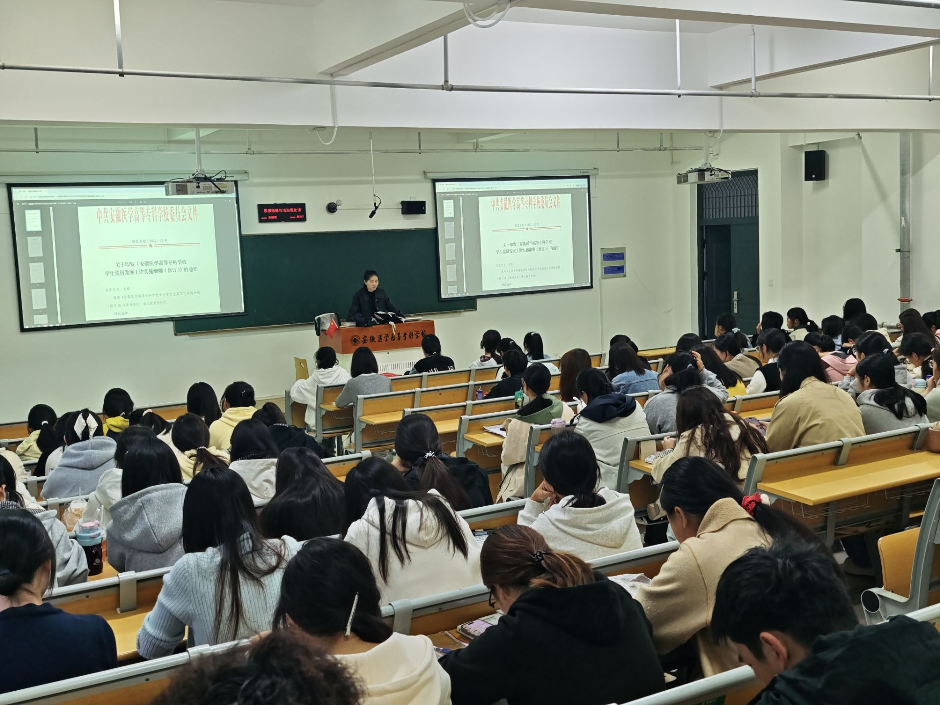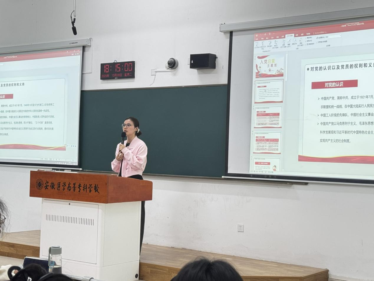 班会伊始,辅导员以“为什么要加入中国共产党”为核心命题,结合护理行业发展历程与党的医疗卫生事业部署展开讲解。从革命时期“红色医护”冒着枪林弹雨救死扶伤,到抗疫期间千万护理党员白衣为甲、逆行出征,再到乡村振兴中护理工作者扎根基层守护群众健康,一组组鲜活案例、一段段感人故事,让学生深刻认识到:党的领导是推动医疗卫生事业发展的根本保证,而护理工作者作为健康中国建设的重要力量,唯有紧跟党的步伐,才能在守护人民健康的道路上走得更稳、更远。同时,辅导员还系统解读了党章中关于党员的基本要求、入党流程及发展党员工作的最新政策,重点强调“思想上入党先于组织上入党”,鼓励学生以“政治坚定、专业过硬、品德高尚”为标准,从日常学习、技能实训、志愿服务中锤炼党性修养。
