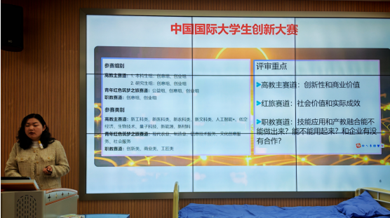 培训现场,张晶晶老师紧扣专业基石、创新思维、实践探索三个维度,紧密结合护理专业特色以及当下大学生竞赛的最新政策,从赛事认知、赛道选择、商业计划书撰写、备赛规划等多个方面,进行了系统全面的讲解。她深入浅出地解读了中国国际大学生创新大赛、“挑战杯”全国大学生课外学术科技作品竞赛以及安徽省“双百”科普创意创新大赛等主流赛事的参赛规则、评审重点和激励政策,让同学们认识到这些赛事在升学深造、综合素质提升等方面所蕴含的重要价值,为学生们打开了一扇了解竞赛优势的全新窗口。